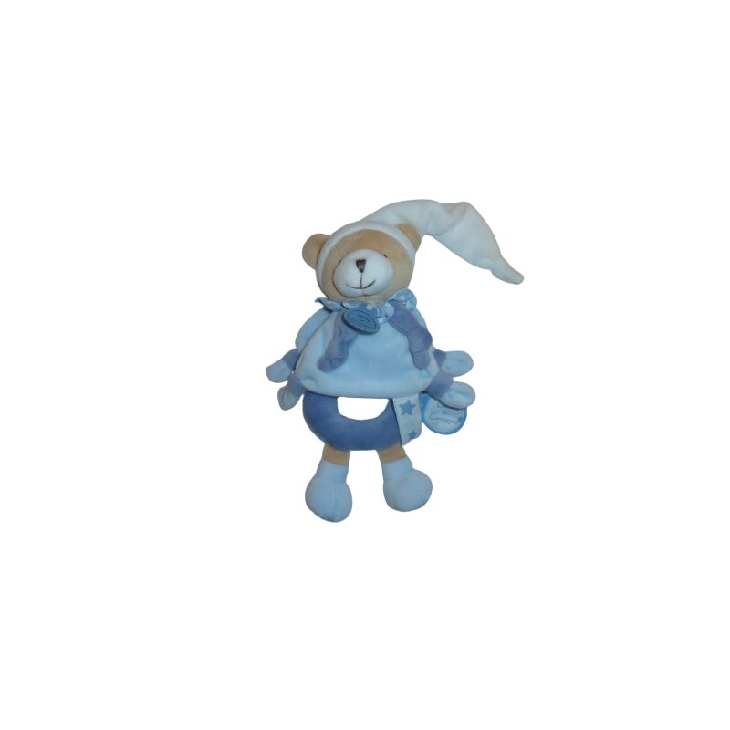 Doudou hochet ours grelot 22 cm environ sans compter le bonnet, bleu blanc. Etat : Neuf sans étiquette boutique. DOUDOU DIFFICILE A TROUVER.
