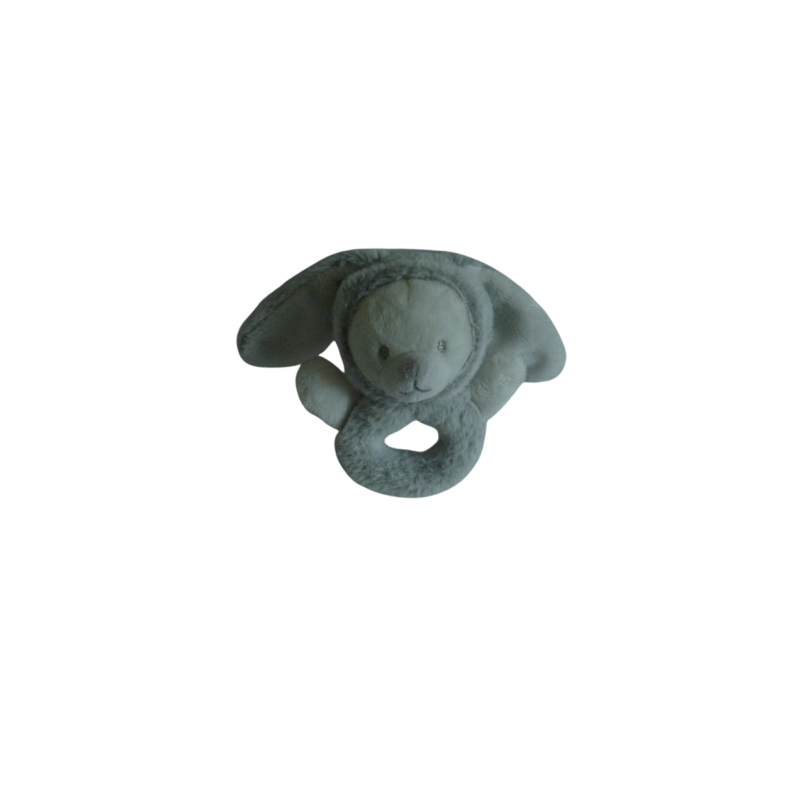 Doudou hochet ours déguisé en lapin 16 cm environ sans compter les oreilles, grelot, gris blanc. Etat : Comme neufRecipient :