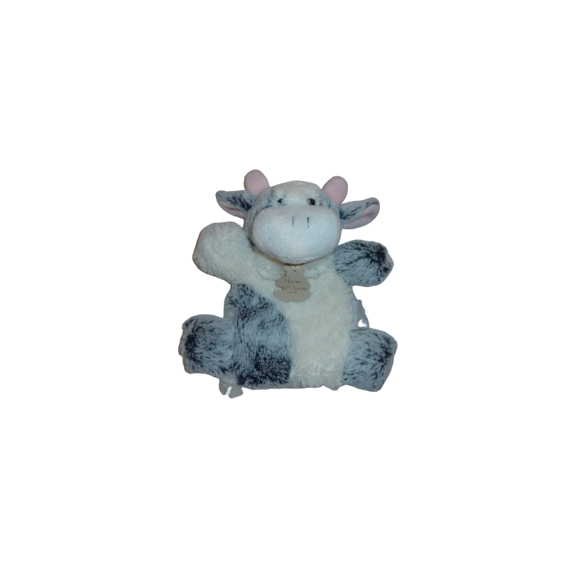 Doudou marionnette vache 24 cm environ, gris blanc. Etat : Excellent état (mais doublure intérieure décousue). DOUDOU DIFFICILE A TROUVER.