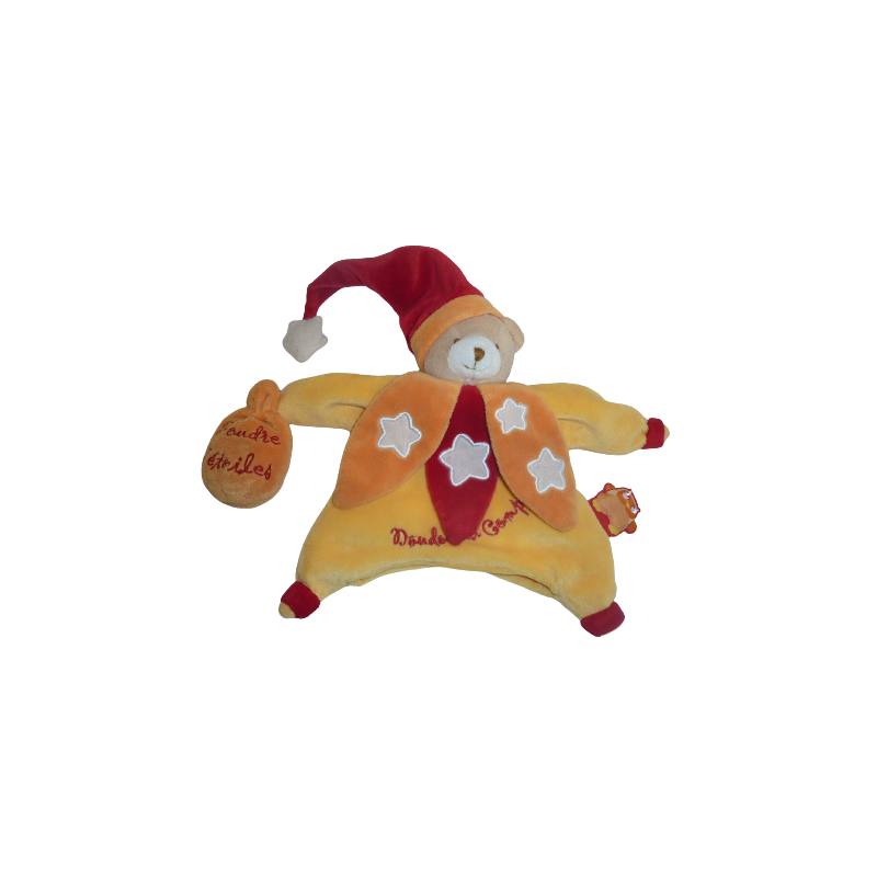 Doudou marionnette ours 23 cm environ sans compter le bonnet, jaune orange rouge. Etat : Très bon état. DOUDOU DIFFICILE A TROUVER.Recipient :