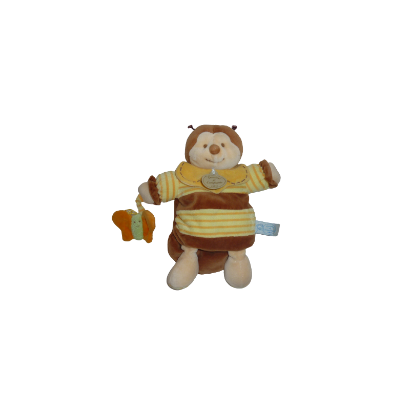 Doudou marionnette bourdon 27 cm environ, tient un papillon bruissant, marron jaune. Etat : Comme neuf (étiquette d'informations coupée). DOUDOU DIFFICILE A TROUVER.