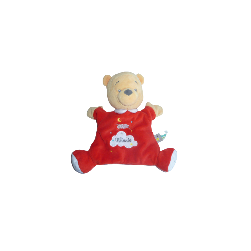 Doudou marionnette Winnie l'ourson 24 cm environ, rouge motifs mouton nuage lune étoiles. Etat : Neuf sans étiquette boutique. DOUDOU DIFFICILE A TROUVER.