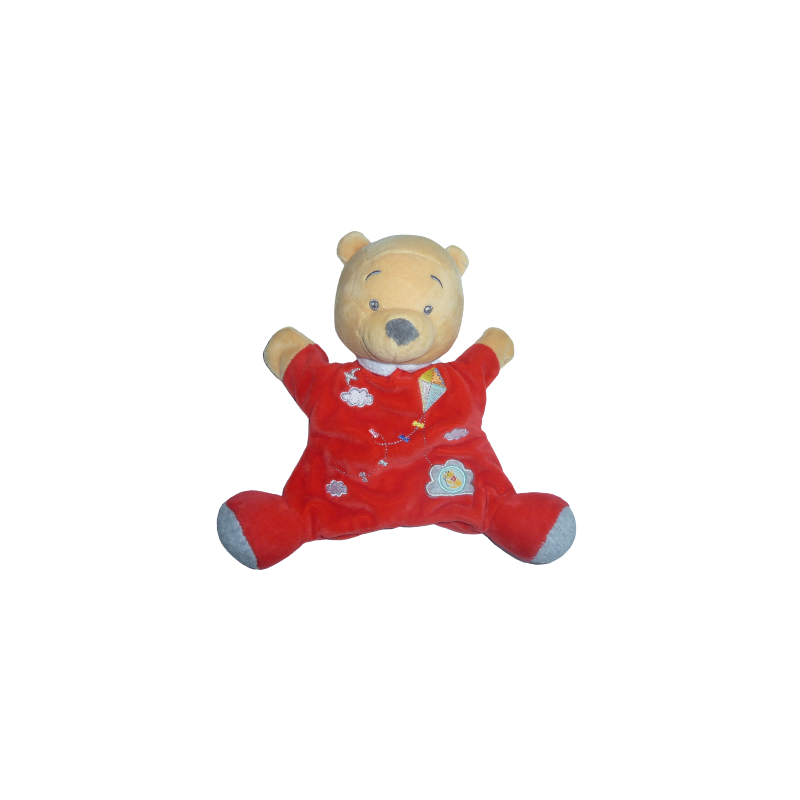 Doudou marionnette Winnie l'Ourson 24 cm environ, rouge motifs. Etat : Neuf sans étiquette boutique. DOUDOU DIFFICILE A TROUVERRecipient :