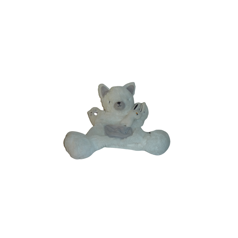 Doudou marionnette ours 28 cm environ petite poche avec lapin, blanc gris motif étoile. Etat : Comme neuf