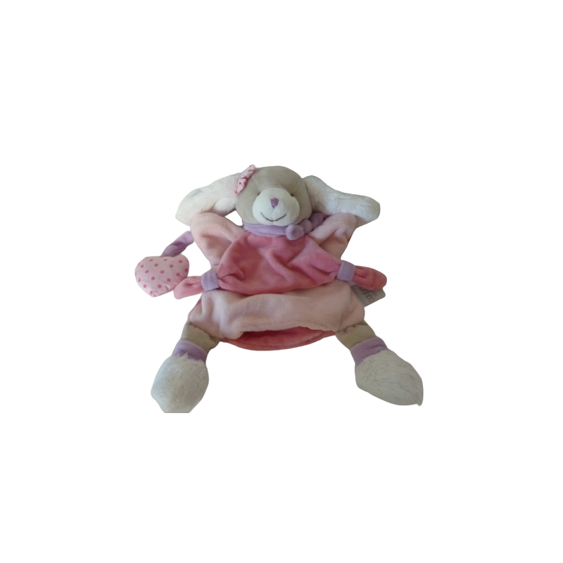Doudou marionnette chien 31 cm environ, rose blanc parme cœur rose à pois bruissant. Etat : Le doudou est en excellent état très très doux, il lui manque son écusson et les rubans du cœur ont été coupé, il est idéal en 2ème voir 3ème doudou.