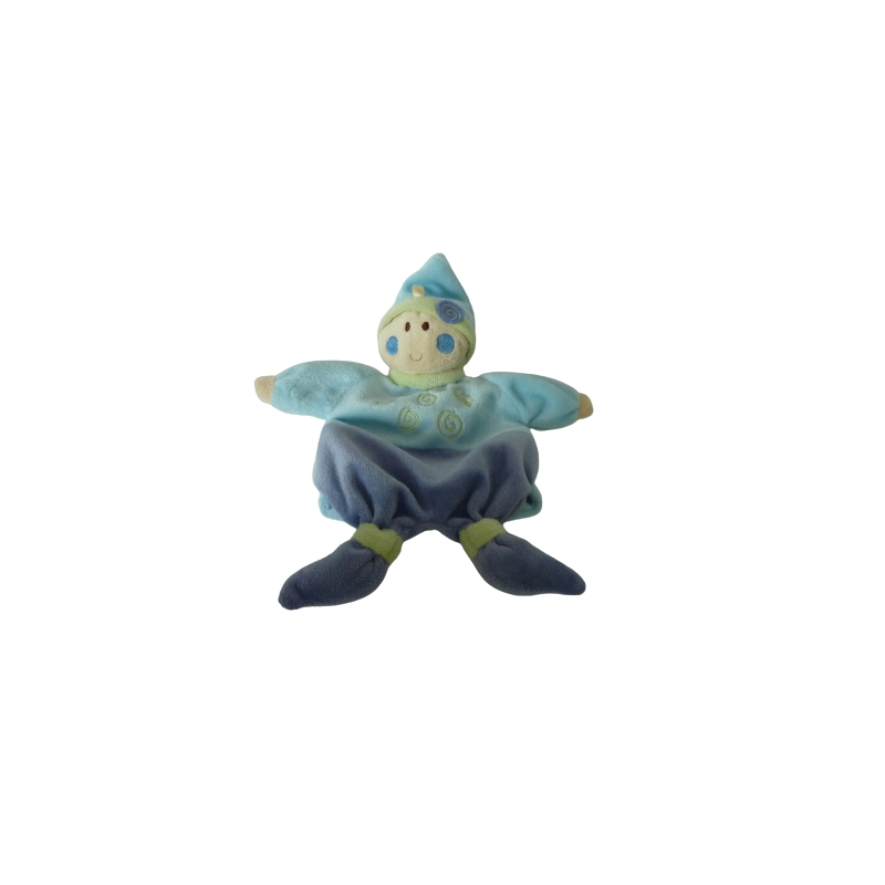 Doudou marionnette lutin 29 cm environ tout compris, bleu violet un rêve de bébé et spirales brodés. Etat : Comme neufRecipient :