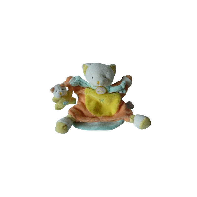 Doudou marionnette chat 24 cm environ, jaune orange turquoise, matière bruissante sur le petit chat. Etat : Comme neuf