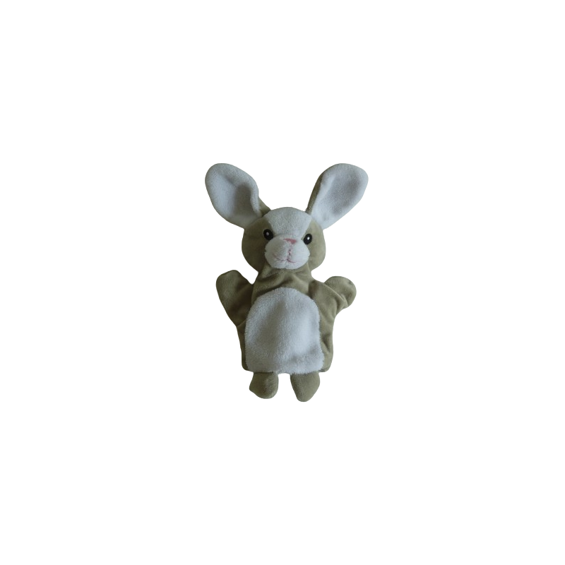 Doudou marionnette lapin 30 cm environ oreilles comprises, gris blanc. Etat : Comme neuf