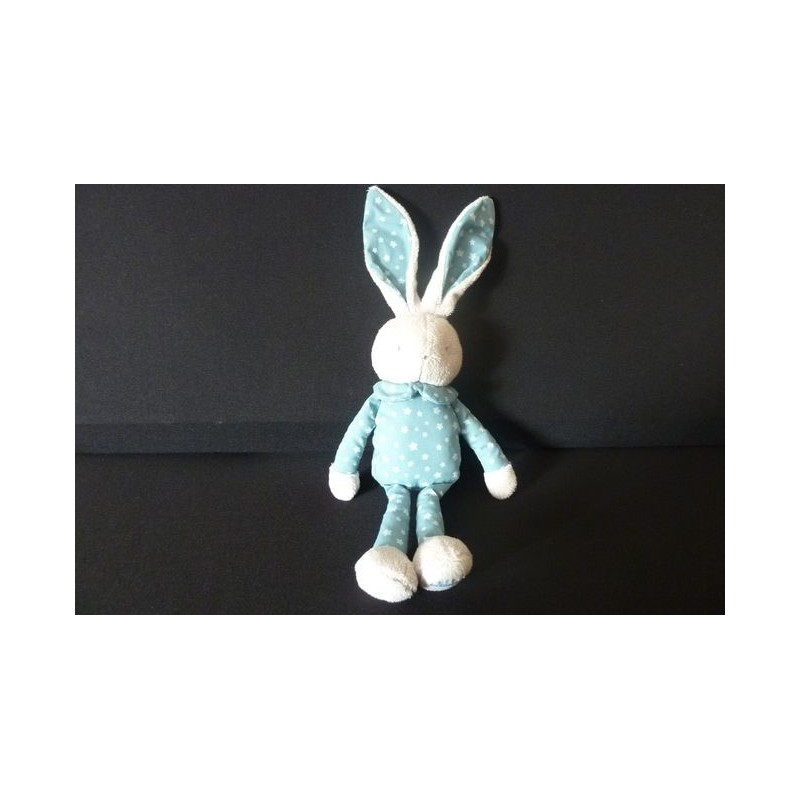 Description du doudou : Doudou peluche lapin de 29 cm environ sans les oreilles. Coloris : bleu étoiles. Doudou super doux. Etat : Comme neuf. Produit original. DOUDOU DIFFICILE A TROUVERRecipient :