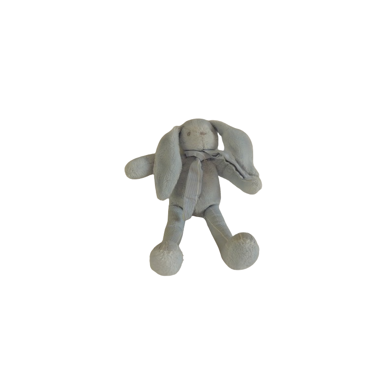 Doudou peluche lapin 25 cm environ sans compter les oreilles, bleu. Etat : Comme neuf (étiquette de la marque coupée)Recipient :