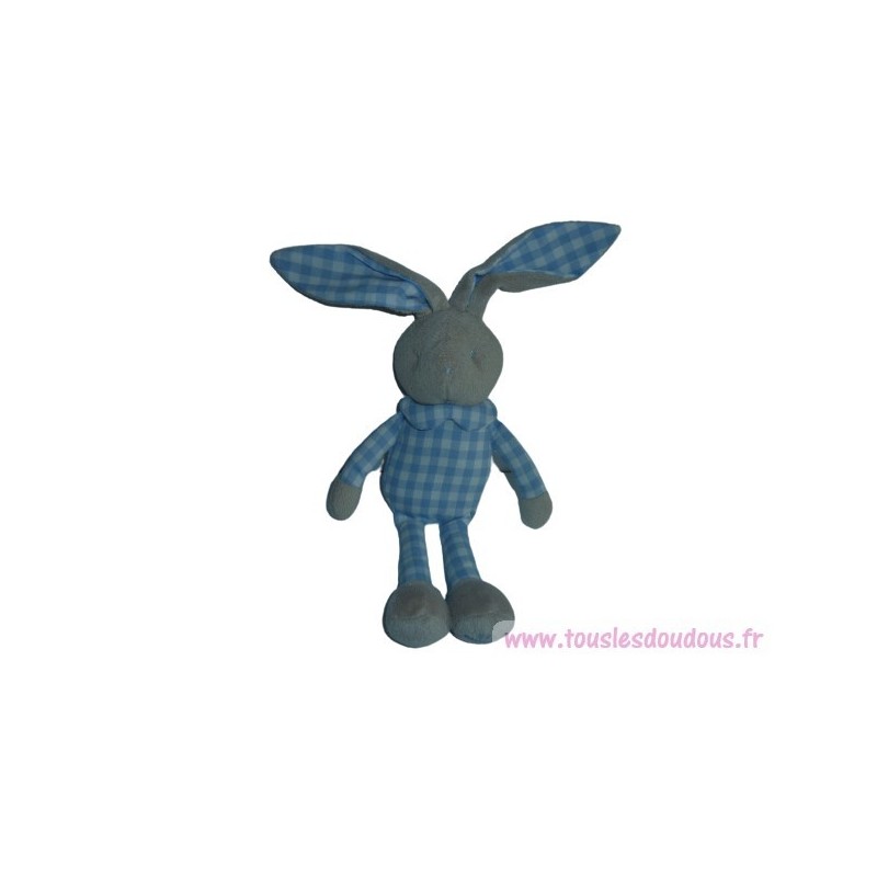 Doudou peluche lapin de 28 cm environ, vichy bleu blanc. Etat : Neuf sans étiquette boutique. SOS DOUDOU DIFFICILE A TROUVER.