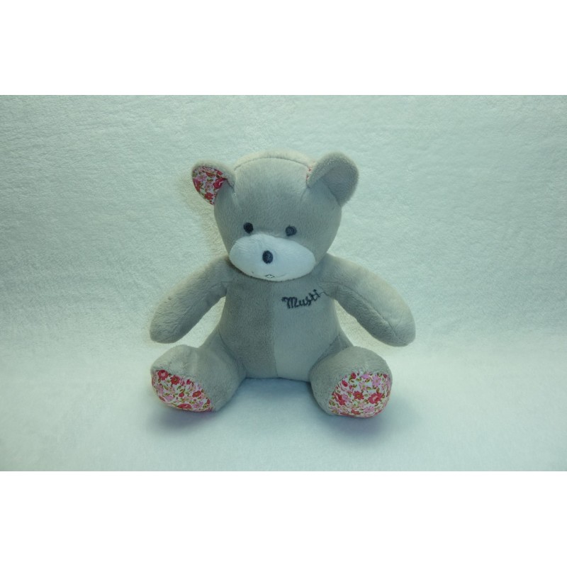 DOUDOU OURS PELUCHE GRIS MOTIF FLEURI MUSTELA