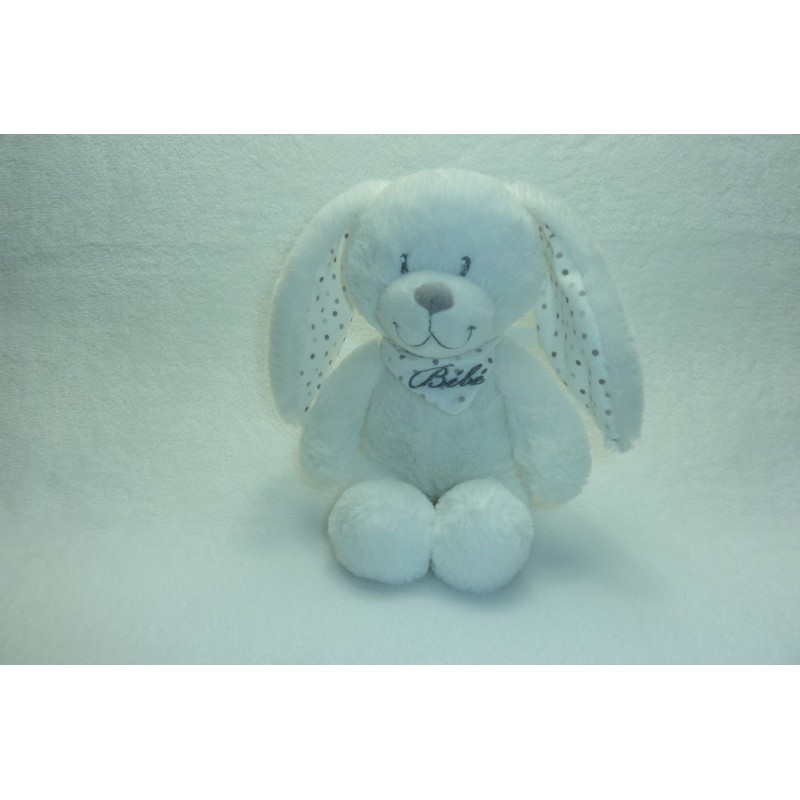 Description du doudou : Doudou peluche lapin de 26 cm environ (sans les oreilles); Coloris : blanc, intérieur des oreilles et écharpe : imprimé petits pois et Bébé brodé sur l'écharpe. Doudou super doux. Etat : Neuf sans étiquette boutique. Produit original.