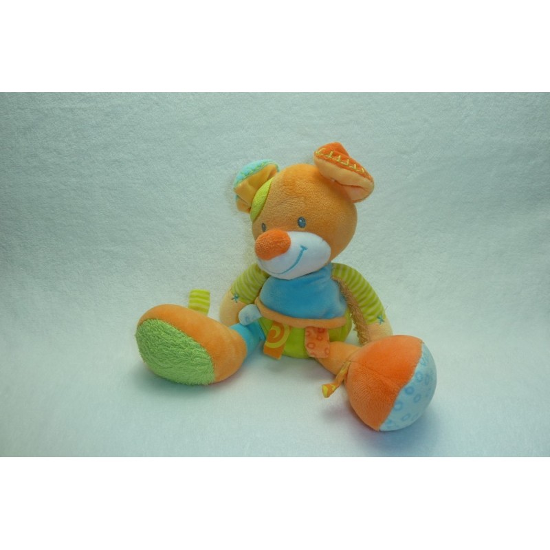 Description du doudou : Doudou peluche chien de 30 cm environ, matière bruissante dans les oreilles. Coloris : orange, vert, turquoise. Doudou super doux. Etat : Neuf sans étiquette boutique. Produit original. DOUDOU DIFFICILE A TROUVER