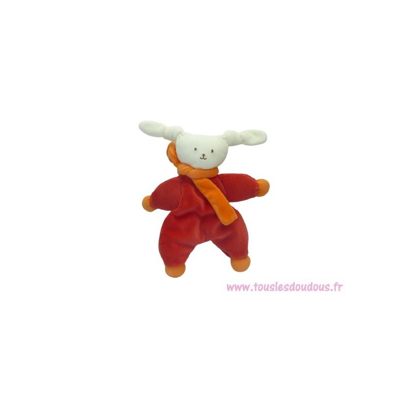 Doudou peluche lapin de 24 cm environ, grelot, rouge orange. Etat : Excellent état. SOS DOUDOU DIFFICILE A TROUVER.