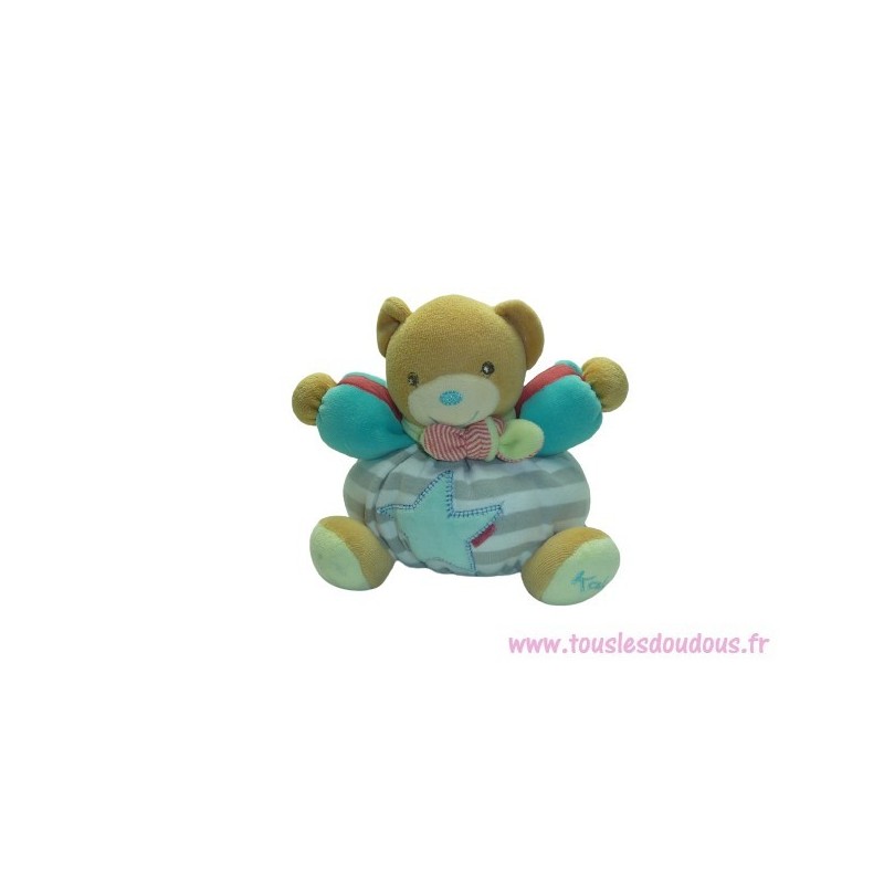 Doudou peluche boule ours de 19 cm environ, grelot, bleu vert gris étoile. Etat : Très bon état. SOS DOUDOU DIFFICILE A TROUVER.