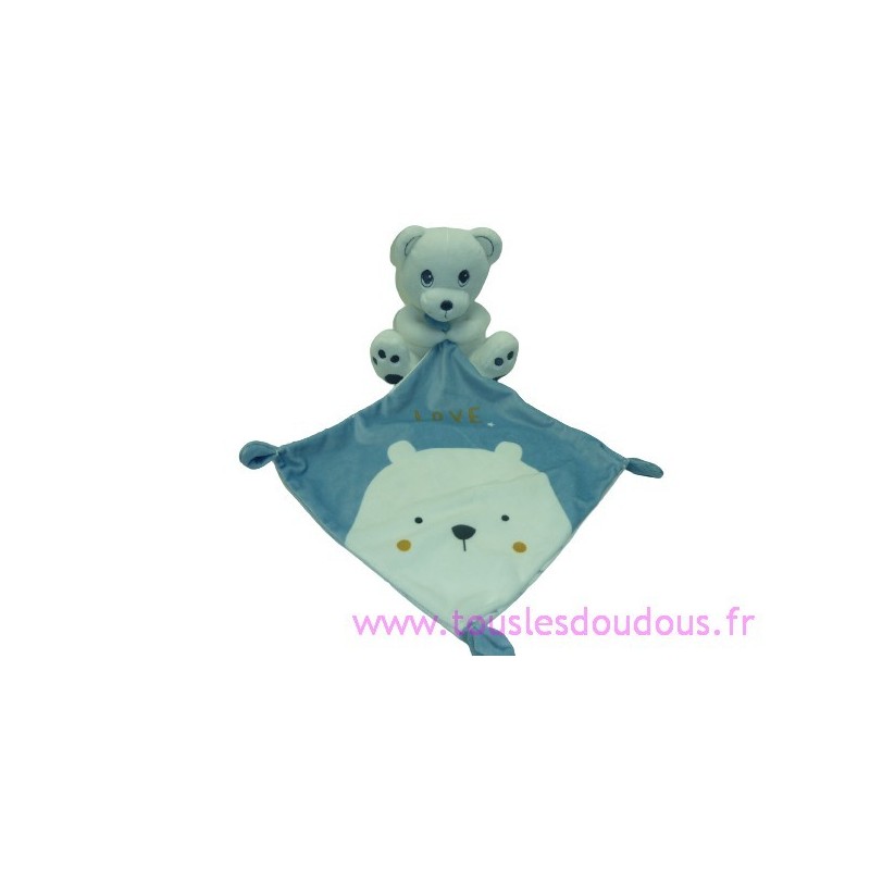 Description du doudou : Doudou peluche ours de 14 cm environ, tient un mouchoir. Coloris : blanc, mouchoir : bleu avec dessin tête d'ours et Love au verso imprimé ours .... Etat : Neuf sans étiquette boutique. SOS DOUDOU DIFFICILE A TROUVER