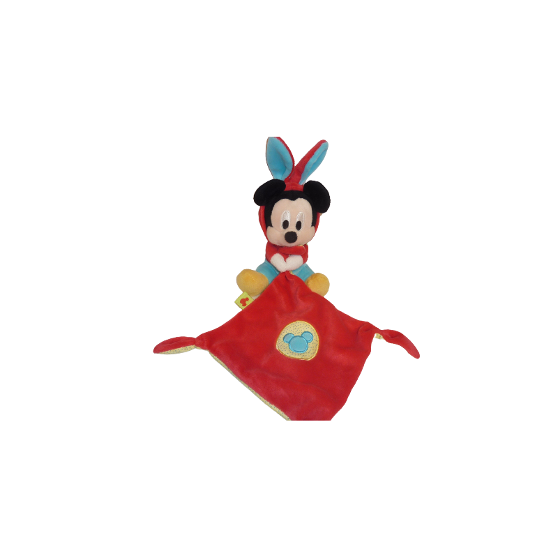 Doudou peluche souris Mickey 15 cm environ, tient un mouchoir, capuche amovible, rouge bleu turquoise. Etat : Comme neuf. DOUDOU DIFFICILE A TROUVER.