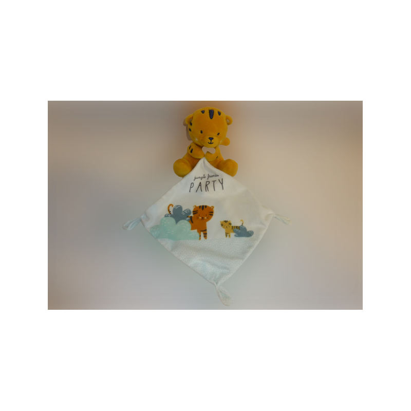 Doudou peluche mouchoir tigre 13 cm environ, moutarde blanc. Etat : Neuf sans étiquette boutique. DOUDOU DIFFICILE A TROUVER.