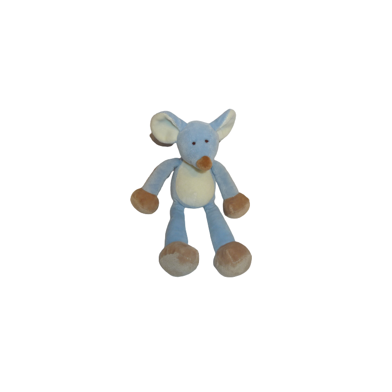 Doudou peluche souris 27 cm environ, billes au popotin et pattes, bleu écru. Etat : Neuf sans étiquette boutique (mini accroc sur une oreille dû à l'attache étiquette boutique). DOUDOU DIFFICILE A TROUVER.