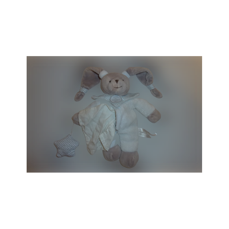 Doudou peluche lapin 25 cm environ sans compter les oreilles, mouchoir, étoile, blanc marron . Etat : Bon état (étiquette de la marque coupée, bouloches). DOUDOU DIFFICILE A TROUVER.