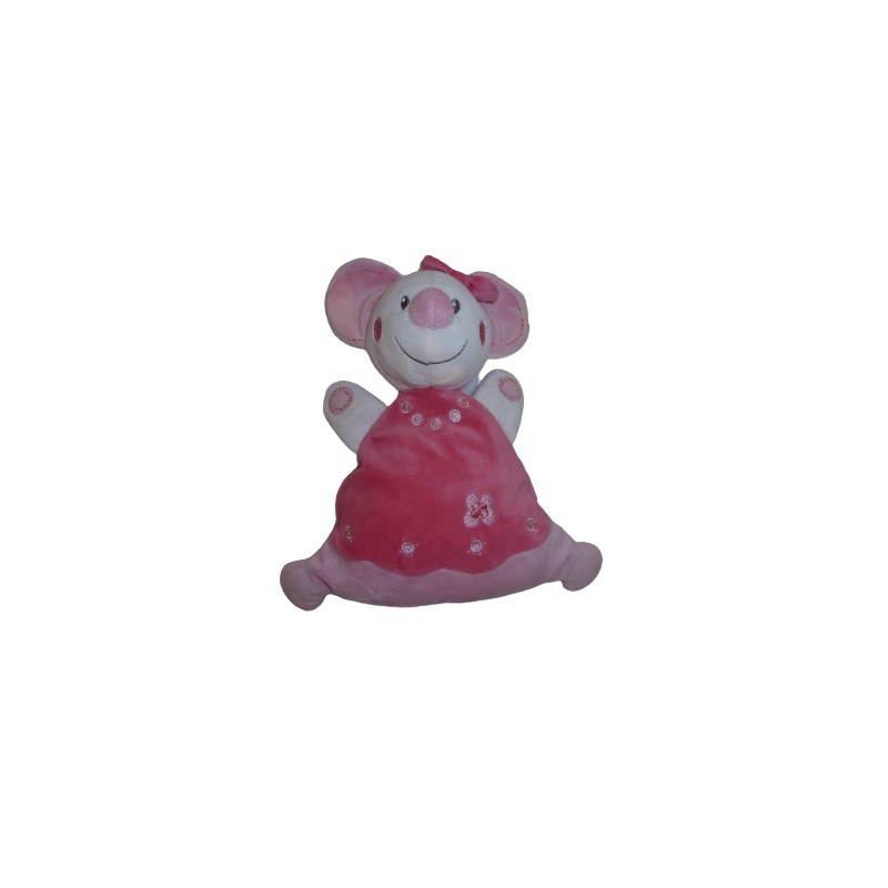 Doudou peluche souris 25 cm environ, rose. Etat : Comme neuf (étiquette de la marque coupée). DOUDOU DIFFICILE A TROUVER.
