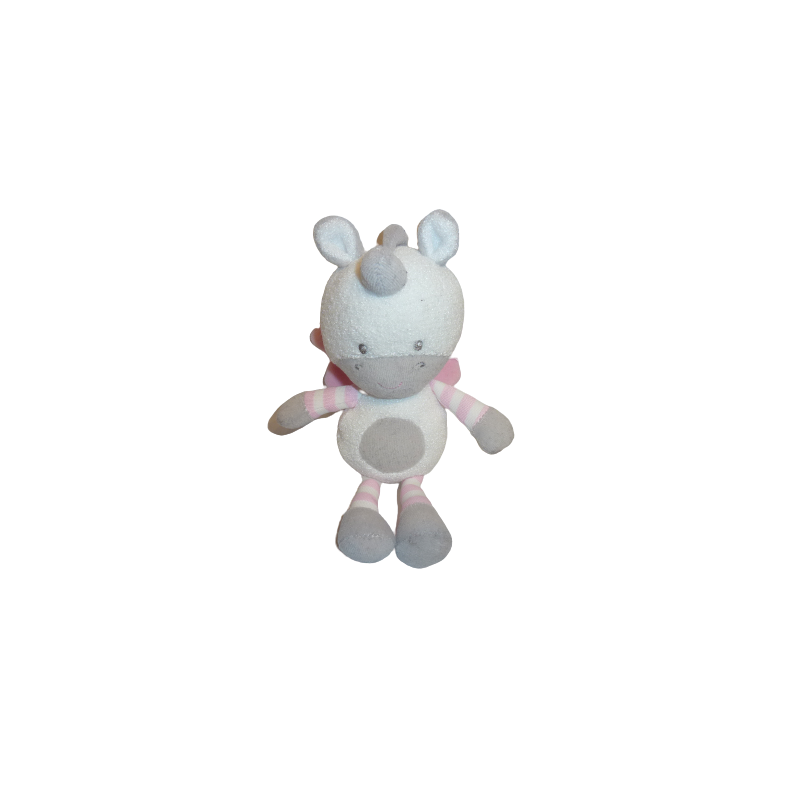 Doudou peluche licorne 22 cm environ, blanc rose, luminescent. Etat : Comme neuf (étiquette de la marque coupée). DOUDOU DIFFICILE A TROUVER.