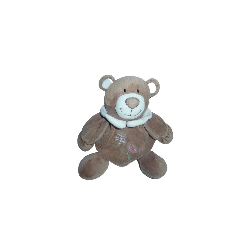 Doudou peluche ours 21 cm environ, marron motif fleurs brodées. Etat : Bon état général. DOUDOU DIFFICILE A TROUVER.