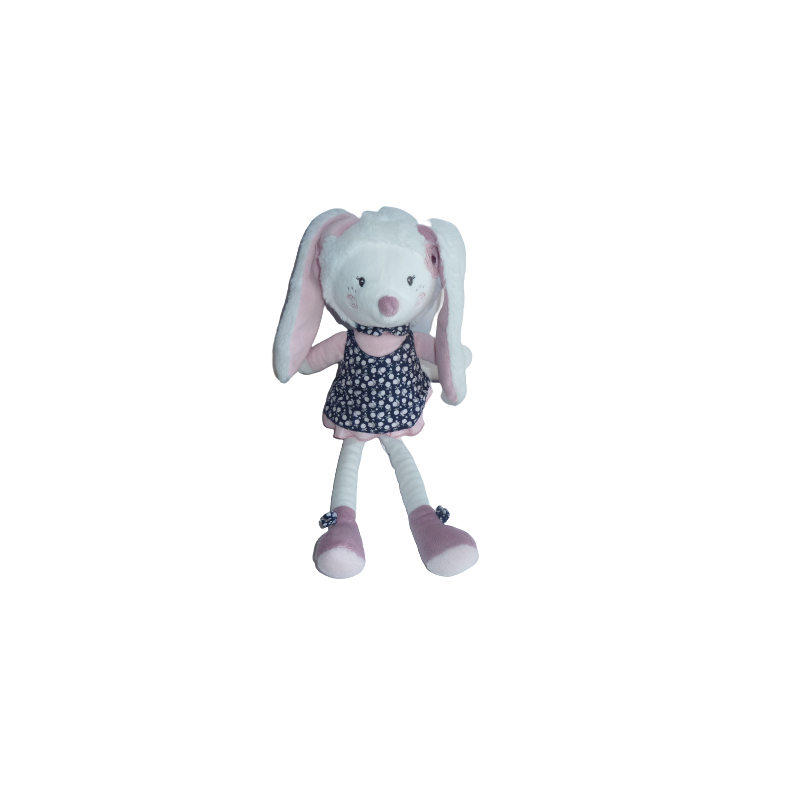 Doudou peluche lapin 40 cm environ (sans compter les oreilles)rose blanc robe fleuri. Etat : Neuf sans étiquette boutique. DOUDOU DIFFICILE A TROUVER.Recipient :