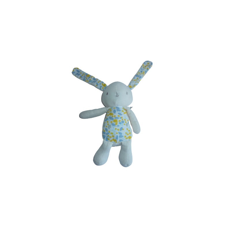 Doudou peluche lapin 21 cm environ sans les oreilles, matière tissu lange, beige motif fleuri. Etat : Neuf sans étiquette boutique. DOUDOU DIFFICILE A TROUVER