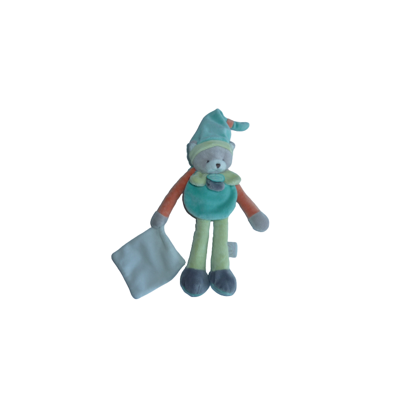 Doudou peluche ours 26 cm environ sans compter le bonnet, vert menthe orange. Etat : Comme neuf. DOUDOU DIFFICILE A TROUVER.Recipient :