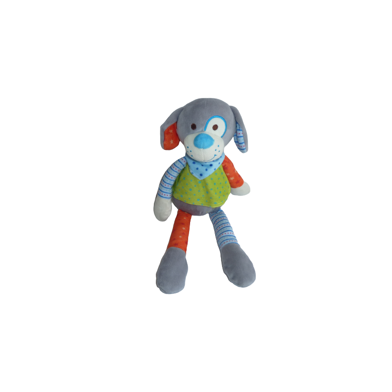 Doudou peluche chien 41 cm environ, grelot, multicolore. Etat : Neuf sans étiquette boutique. DOUDOU DIFFICILE A TROUVERRecipient :