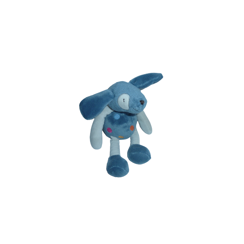 Doudou peluche chien 28 cm environ, bleu gris motif ronds. Etat : Comme neuf. DOUDOU DIFFICILE A TROUVER