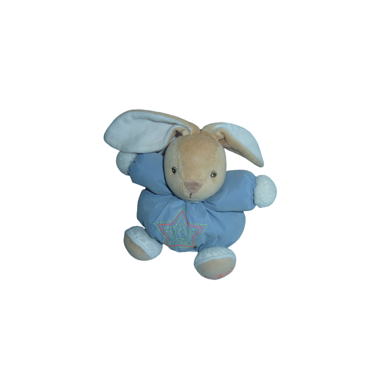Doudou peluche lapin forme boule 18 cm environ sans les oreilles, bleu motif étoile. Etat : Neuf sans étiquette boutique. DOUDOU DIFFICILE A TROUVERRecipient :