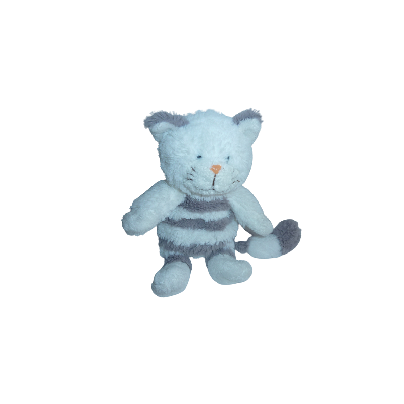 Doudou peluche chat 25 cm environ sans la queue, blanc écru rayures taupe, billes au popotin. Etat : Comme neuf (étiquette d'informations coupée). DOUDOU DIFFICILE A TROUVERRecipient :