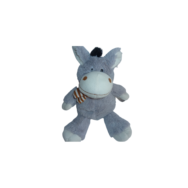 Doudou peluche âne 38 cm environ, gris écharpe rayures blanc marron. Etat : Neuf sans étiquette boutique. DOUDOU DIFFICILE A TROUVER