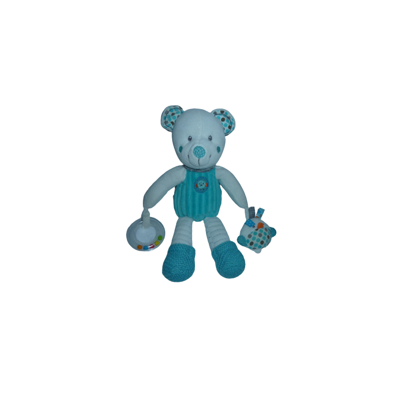 Doudou peluche ours éveil 30 cm environ, blanc turquoise, anneau grelot. Etat : Neuf sans étiquette boutique. DOUDOU DIFFICILE A TROUVERRecipient :