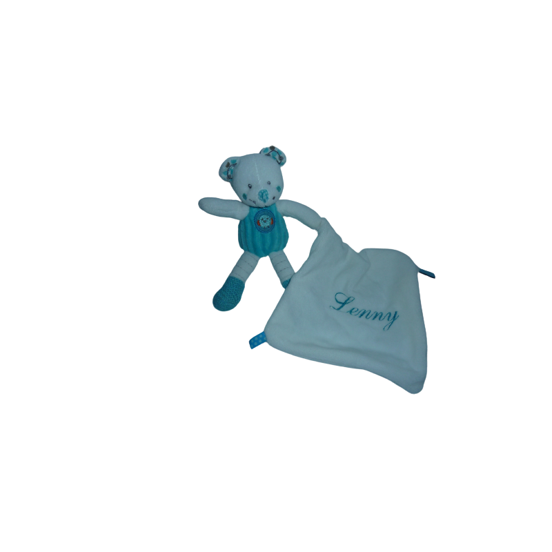 Doudou peluche mouchoir ours 20 cm environ, blanc turquoise, ATTENTION : PRENOM DE LENNY BRODE SUR LE MOUCHOIR. Etat : Comme neuf. DOUDOU DIFFICILE A TROUVERRecipient :