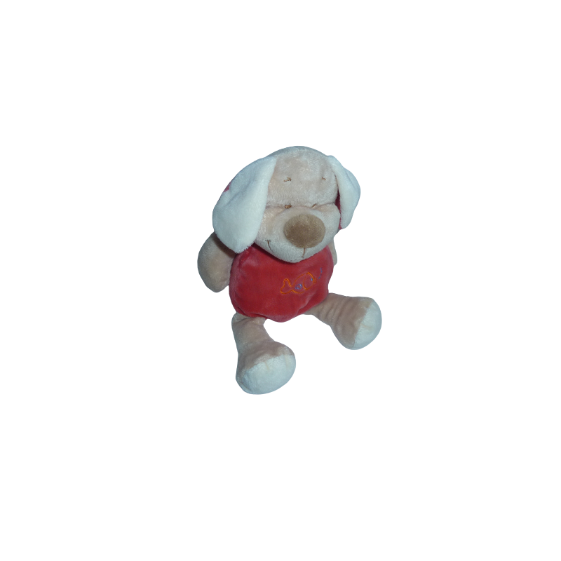Doudou peluche chien 28 cm environ, marron rouge motif poisson. Etat : Très bon état. DOUDOU DIFFICILE A TROUVER