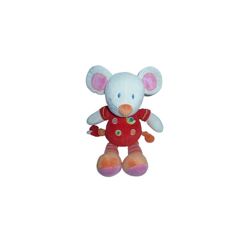Doudou peluche souris 28 cm environ, rouge rose orange…, escargot ronds brodés. Etat : Très bon état (étiquette de la marque coupée). DOUDOU DIFFICILE A TROUVER