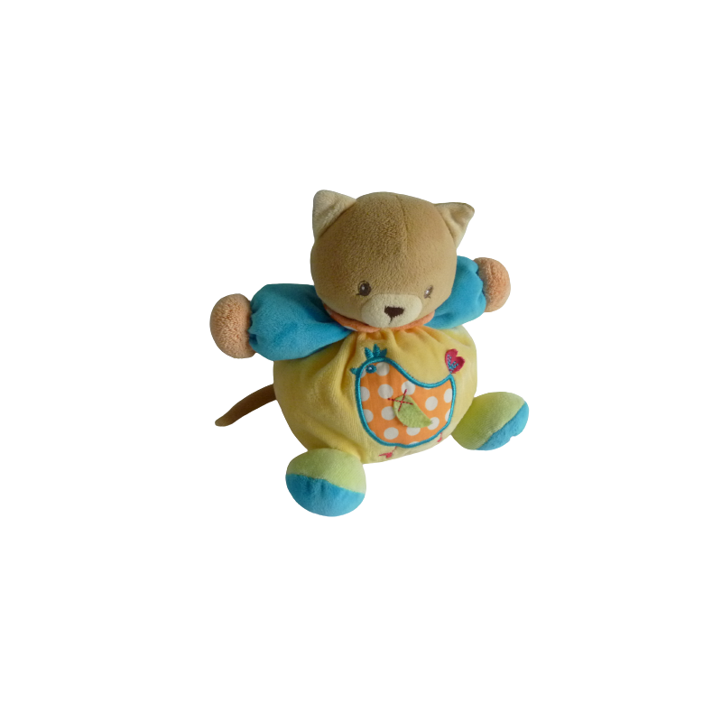 Doudou peluche boule chat 20 cm environ, multicore motif poule. Etat : Comme neuf. DOUDOU DIFFICILE A TROUVER