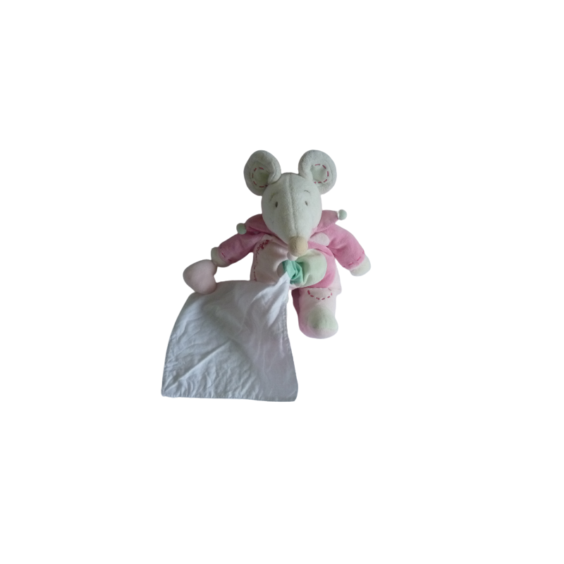 Doudou peluche souris 34 cm environ, rose blanc, mouchoir blanc. Etat : Très bon état