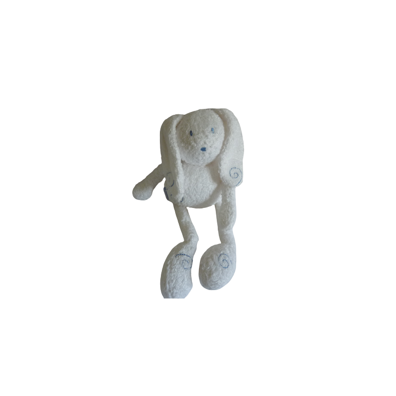 Doudou lapin peluche 35 cm environ sans les oreilles, billes au popotin, blanc motif spirales bleus. Etat : Comme neuf. DOUDOU DIFFICILE A TROUVER