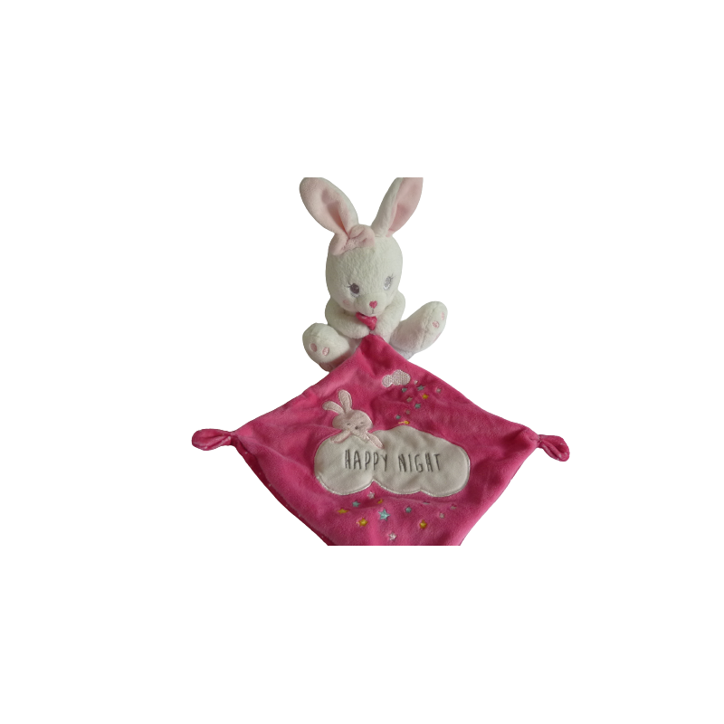 Doudou peluche lapin mouchoir 14 cm environ sans les oreilles, blanc, mouchoir : fuschia motif lapin étoiles …Happy Night. Etat : Comme neuf (étiquette de la marque coupée)