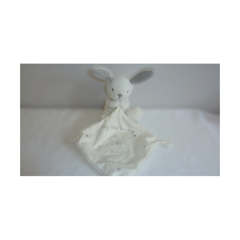 Doudou peluche mouchoir lapin 15 cm environ sans compter les oreilles, mouchoir : 16x16 cm environ, blanc gris. Etat : Comme neuf (étiquette de la marque coupée)