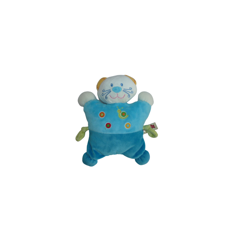 Doudou peluche chat 25 cm environ, bleu écru motifs rond escargot, 2 nouages vert de chaque côté. Etat : Comme neufRecipient :