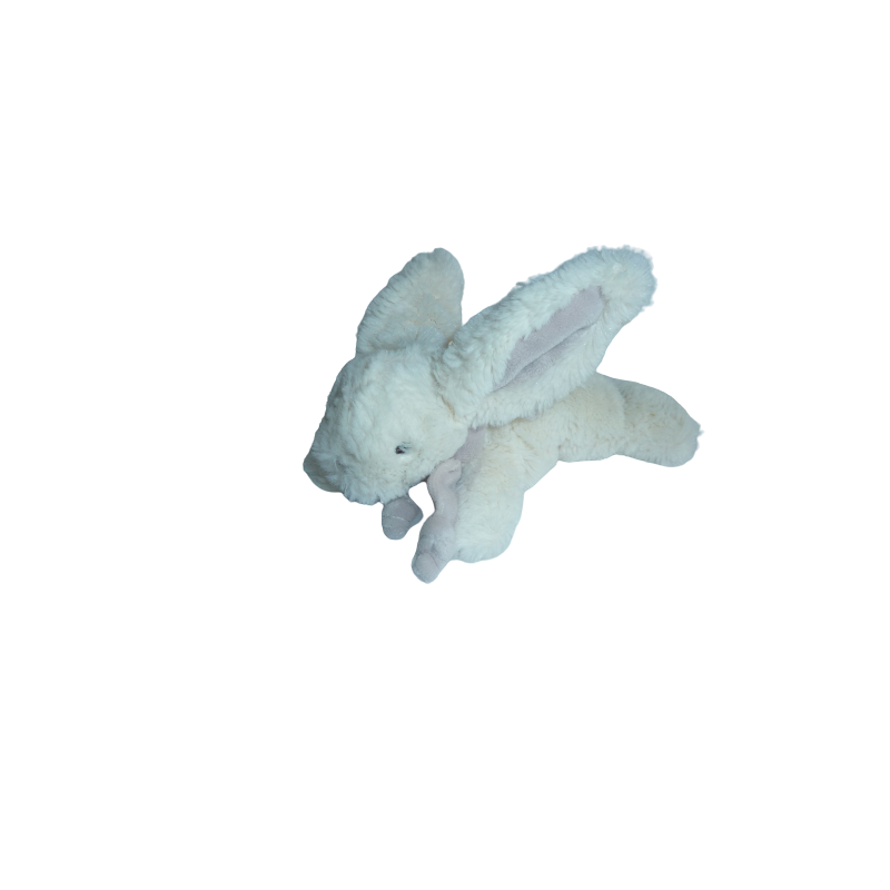 Doudou peluche lapin 18 cm environ de longueur, blanc intérieur et écharpe taupe. Etat : Parfait état mais manque l'écussonRecipient :