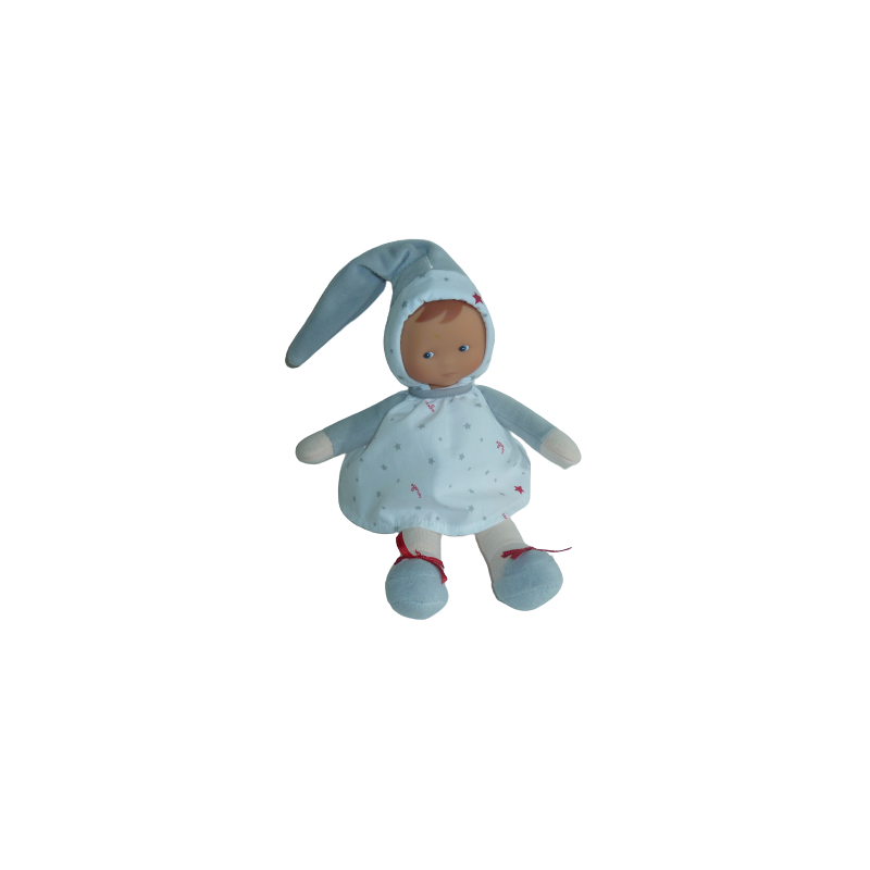 Doudou peluche poupée 26 cm environ sans compter le bonnet, gris robe imprimé étoiles corolle. Etat : Comme neuf (minis traces sur le front d'origine, étiquette d'informations coupée)Recipient :