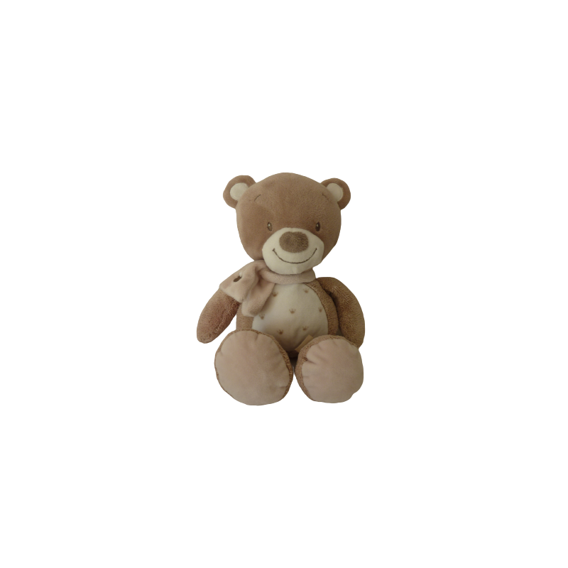 Doudou peluche ours 31 cm environ, billes au popotin, marron écru motif couronne. Etat : Parfait état