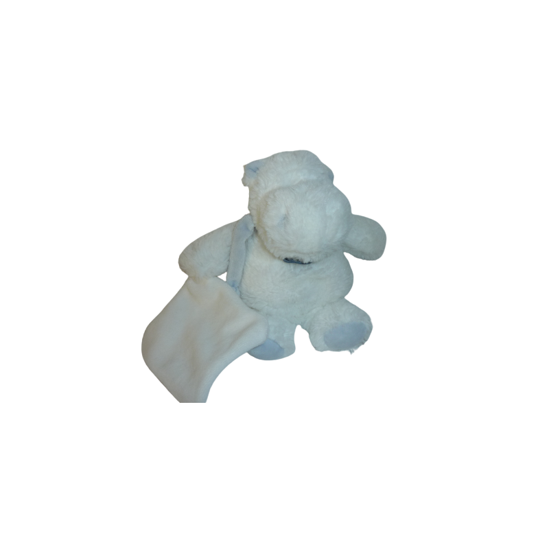 Doudou peluche hippopotame 21 cm environ blanc bleu, mouchoir blanc 10x10 cm environ. Etat : Parfait état